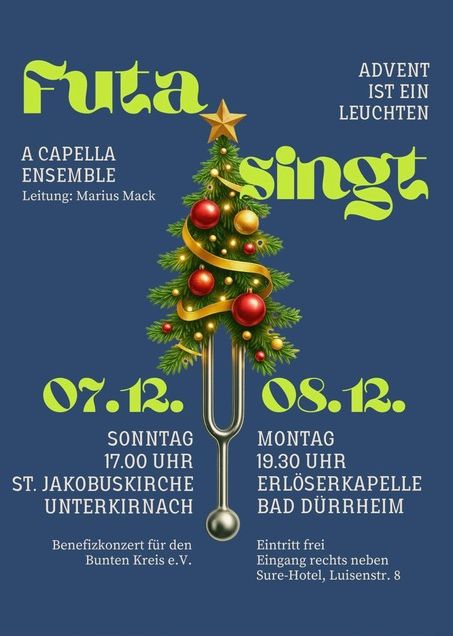 Das Konzert findet zugunsten des Bunten Kreis e.V. statt, der sich für eine sozialmedizinische Nachsorge in der Region Schwarzwald-Baar-Heuberg-Hegau-Bodensee einsetzt. Die Besucher dürfen sich auf eine klangvolle Einstimmung in die Weihnachtszeit freuen: Das 15-köpfige Ensemble präsentiert Advents- und Weihnachtslieder vom 15. Jahrhundert bis zur Gegenwart und lädt mit vielfältigen Klangfarben dazu ein, das adventliche Leuchten neu zu entdecken.